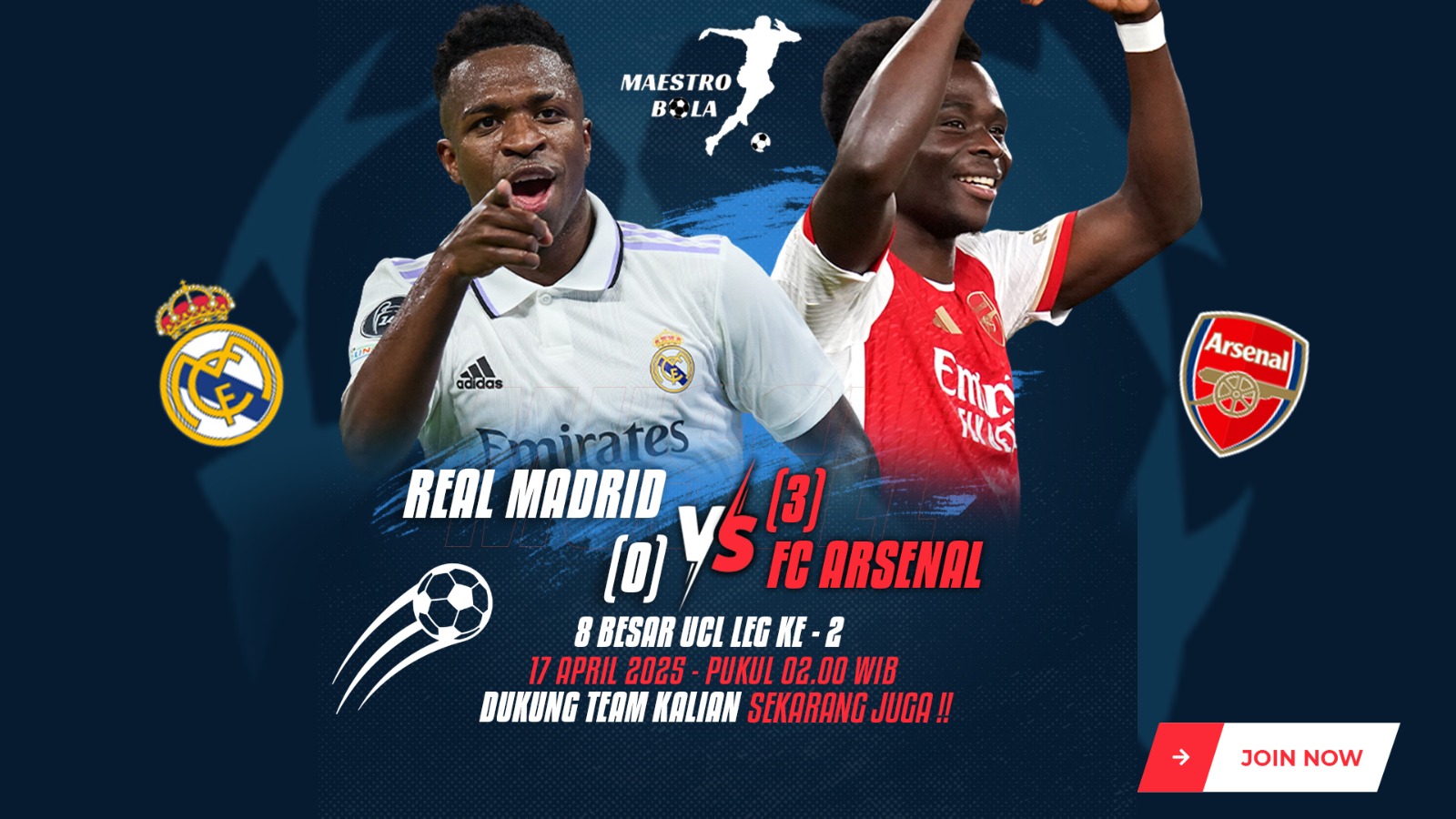 Pertandingan Real Madrid vs Arsenal akan tersaji pada leg kedua babak perempat final Liga Champions 2024-2025 . Laga ini akan berlangsung di Stadion Santiago Bernabeu pada Kamis, 17 April 2025, pada pukul 02.00 WIB dan disiarkan langsung oleh Vidio dan Bein Sports.